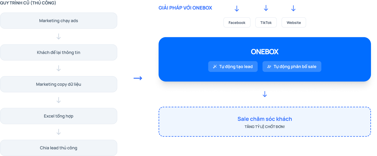 OneBox giúp doanh nghiệp tập trung toàn bộ dữ liệu khách hàng từ nhiều kênh về một hệ thống duy nhất.